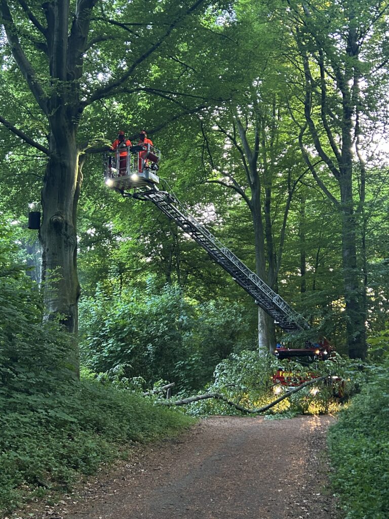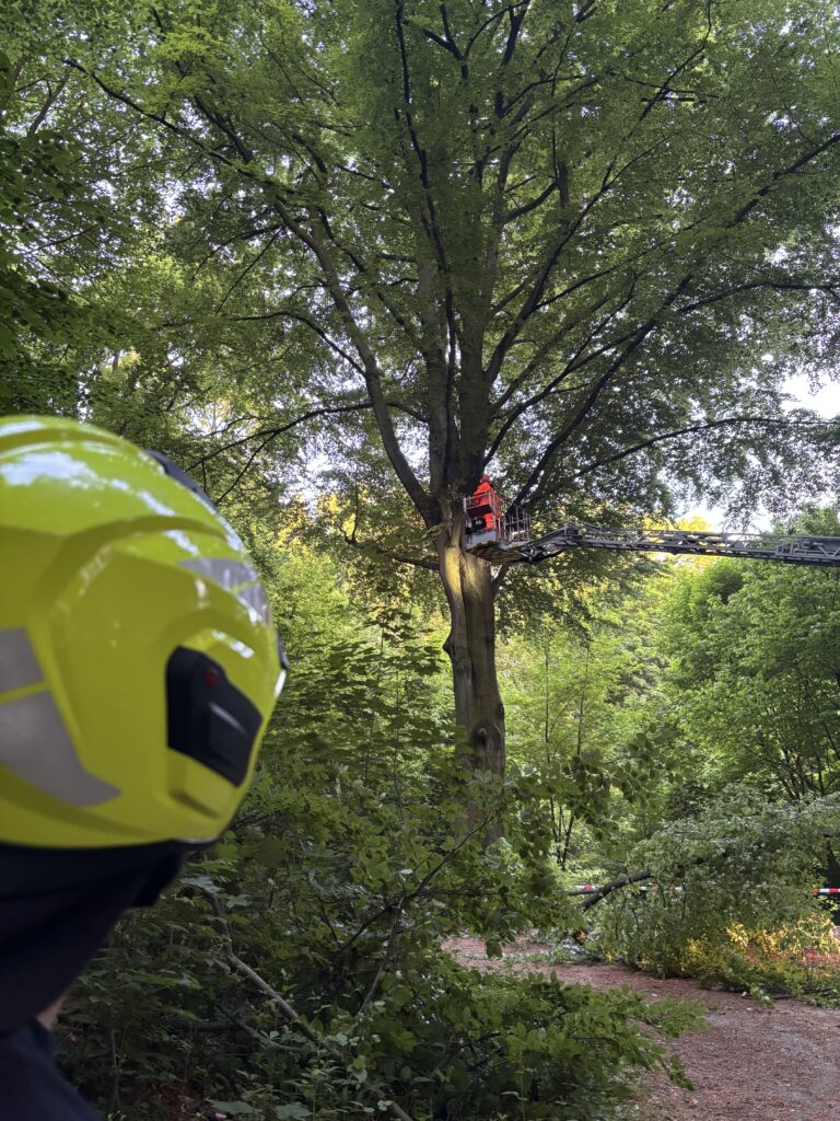 Um 22:00 Uhr kam dann erneut das Alarmstichwort ,,TH-Sturm“. An der Einsatzstelle angekommen, hing ein großer Ast von einem Baum herunter. Mit Hilfe von Rundschlingen, die am Löschfahrzeug befestigt wurden, konnte der Ast aus dem Baum entfernt werden. Nachdem die Kameraden und Kameradinnen die Straße wieder befahrbar gemacht haben, konnten alle Fahrzeuge wieder einrücken und der Löschzug konnte in den wohlverdienten Feierabend.