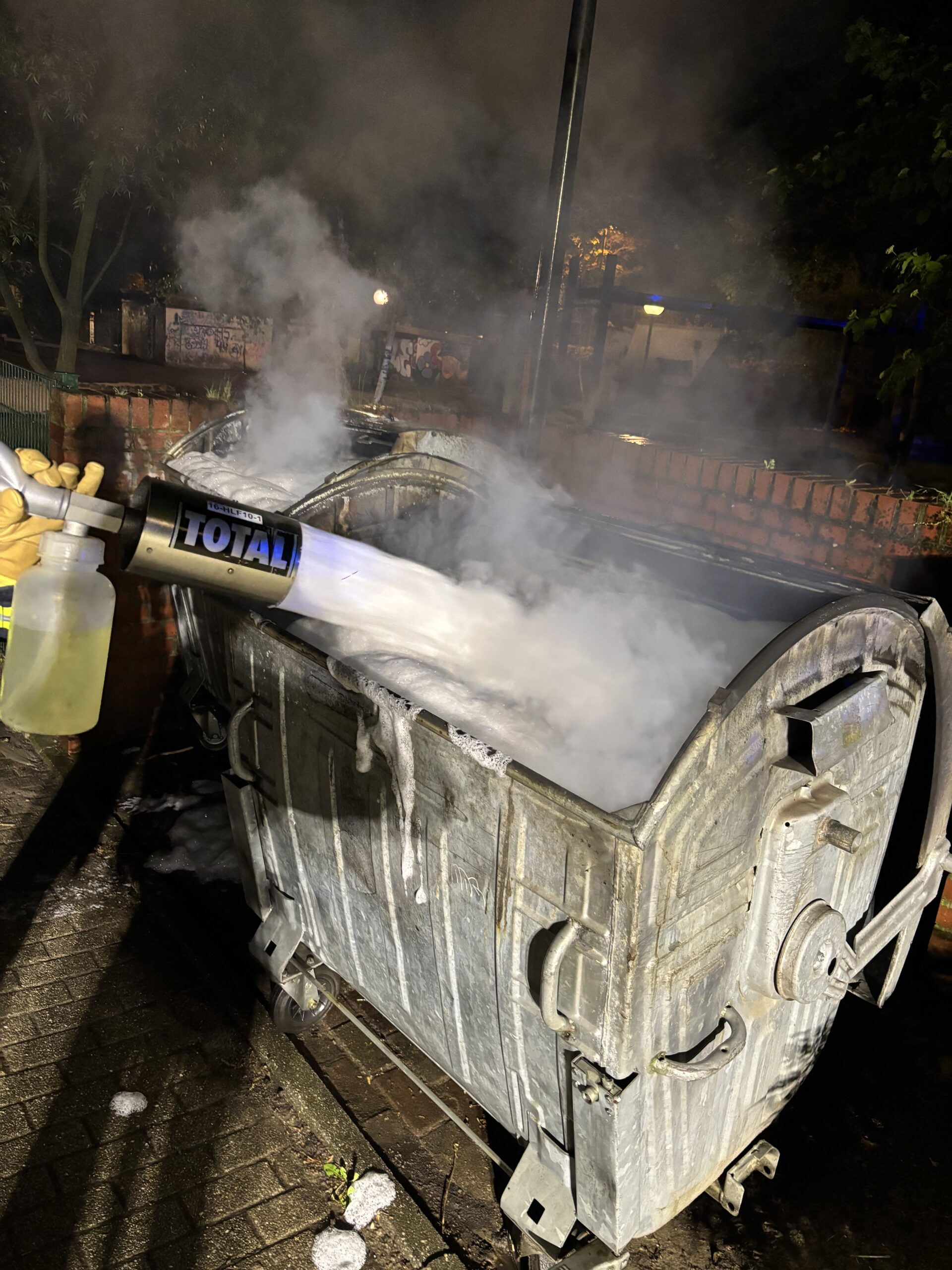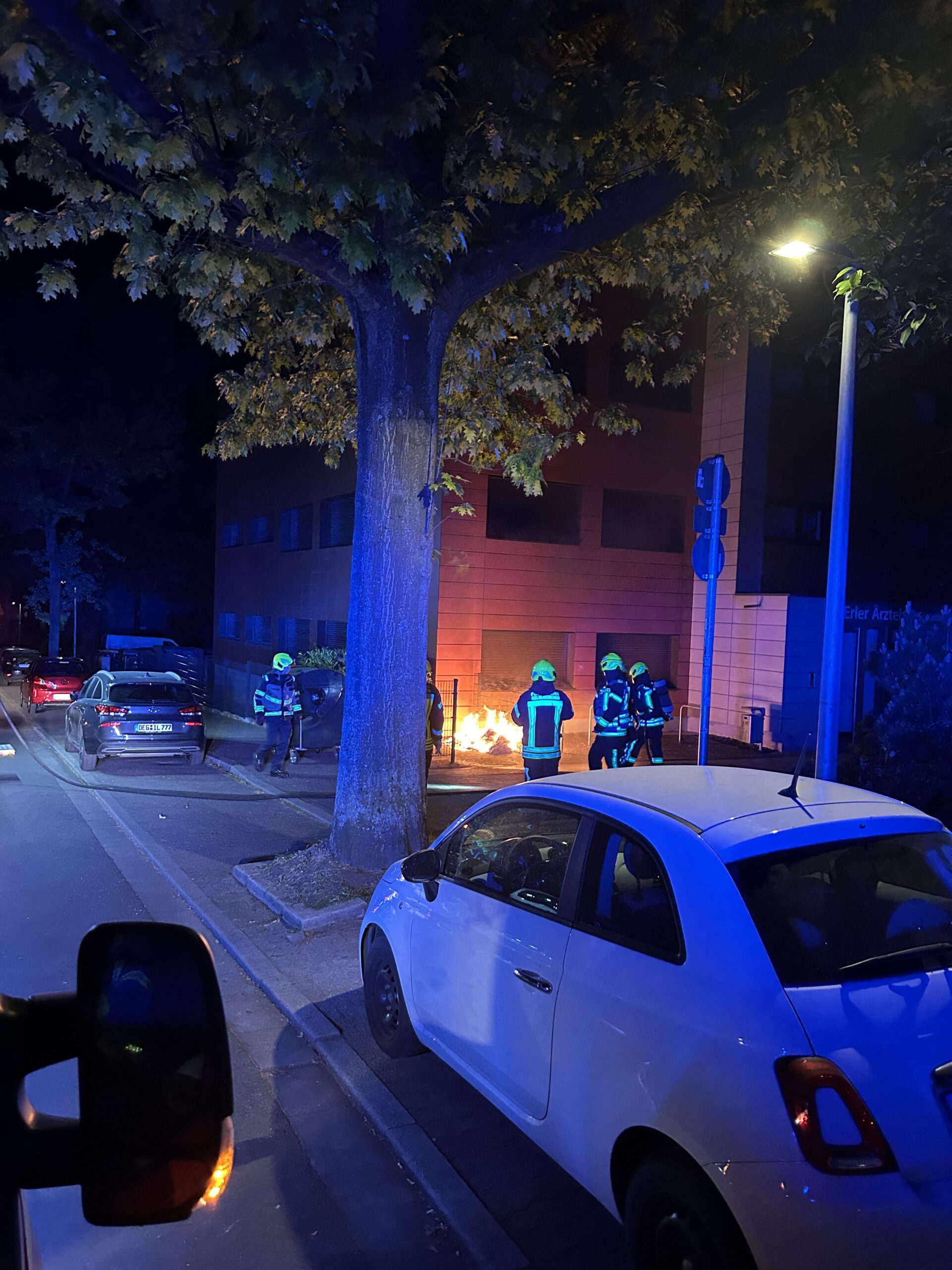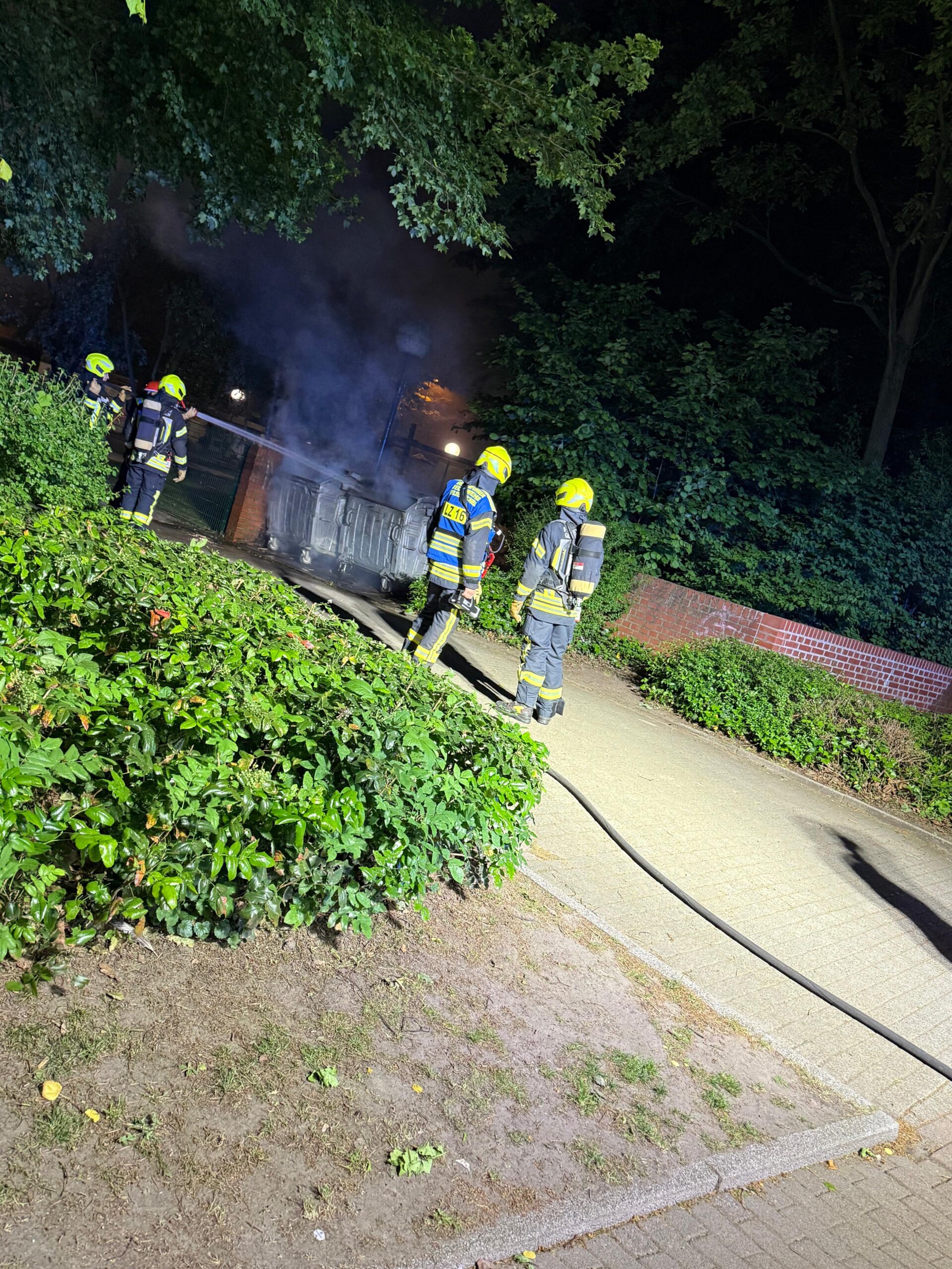 Um 1:00 Uhr wurde der Löschzug dann erneut nach Erle zu einer brennenden Mülltonne alarmiert. An der Einsatzstelle angekommen, stellte sich heraus, dass an einer Hausfassade zwei Mülltonnen in Vollbrand standen. Nachdem der Angriffstrupp den Brand mittels Schnellangriff gelöscht und die Fassade gekühlt hatte, konnte der Löschzug wieder das Gerätehaus anfahren. In der Nacht musste der Löschzug bis 3:30 Uhr zu insgesamt drei weiteren brennenden Mülltonnen ausrücken, alle in der gleichen Nachbarschaft. Gegen 4:00 Uhr waren dann alle Einsätze abgearbeitet und es folgte eine Ruhephase.